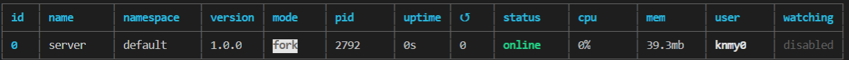 위는 터미널에서 npm start를 사용할시 pm2 start server.js를 수행한다는 의미이다. 터미널에서 npm start를 입력하면 다음과 같은 화면이 나오면 정상적으로 수행된 것이다.