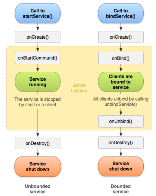 안드로이드의 서비스란 긴 작업을 백그라운드에서 수행하는데 사용되는 UI를 제공하지 않는 컴포넌트이다. 그리고 IPC(Inter-Process Communication; 프로세스간 통신)를 지원한다. 서비스가 사용되는 예시로는 음악 재생, 네트워킹, 파일 입출력, Content Provider와 상호작용 등이 있다. 특별히 중요한 점은 백그라운드에서 수행한다는 말이 메인 쓰레드에서 수행되지 않는 다는 말과 같지 않다는 점이다. 즉, 서비스는 메인 쓰레드에서 수행된다. 그렇기에 음악재생, 네트워킹과 같은 Intensive I/O 작업들은 서비스 내에서 별도의 쓰레드를 생성하여 작업하는 것이 올바르다.