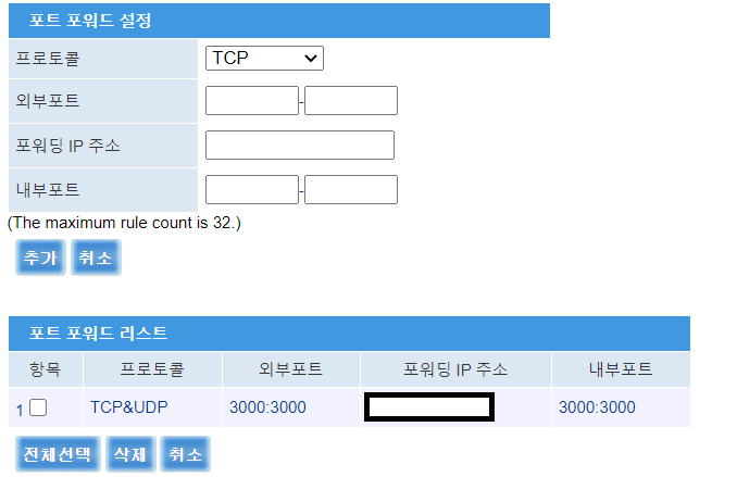 위는 서버로 구동되는 3000번 포트만 개방한 모습이다. 포워딩 IP 주소는 위의 ipconfig에서 획득한 주소를 사용하면 된다.