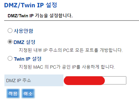 얻어온 주소를 아래와 같이 DMZ IP 주소 입력란에 입력 후 적용한다.