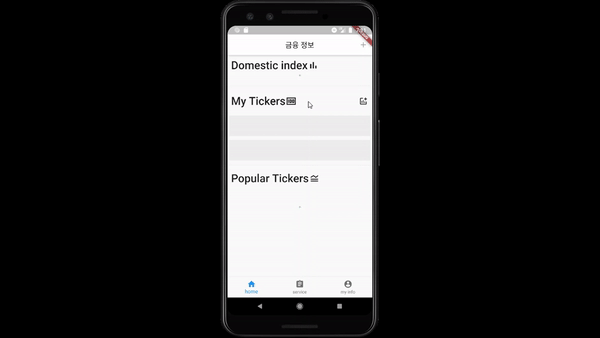 앱을 구동하자마자 바로 UI가 동작하는 모습이다. 위는 심지어 배속도 없는 결과이다. (참고로 MyTickers 밑의 회색 UI는 네트워킹을 통해 추가로 데이터를 가져오는 중이라 로딩이 조금 더 걸리는 상태이다.)