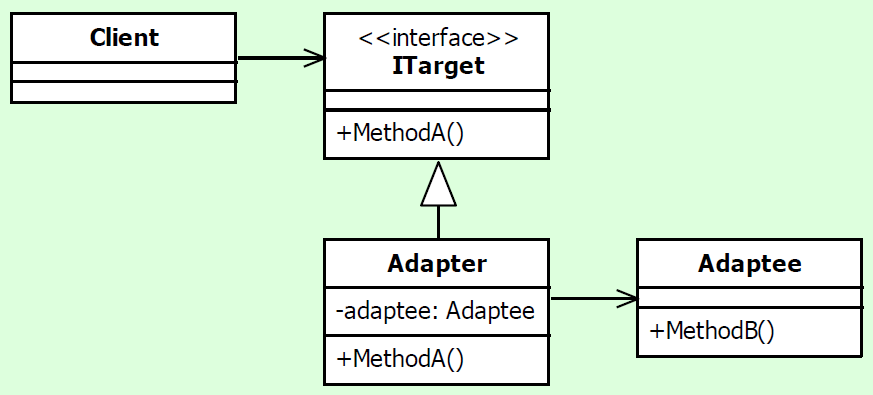 - Adaptee: ITarget 인터페이스의 요소로 집어넣고 싶은 클래스