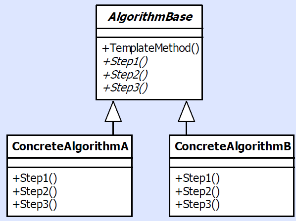위 구조를 보면 부모 클래스인 AlgorithmBase에서 전반적인 과정을 수행하는 TemplateMethod()가 존재하고, 그 외에 세부 메서드인 Step1(), Step2(), Step3()가 존재한다. TemplateMethod()에서는 해당 세부 메서드를 수행하게 된다. 그리고 자식 클래스인 ConcreateAlgorithmA,B는 이를 상속 받는다.