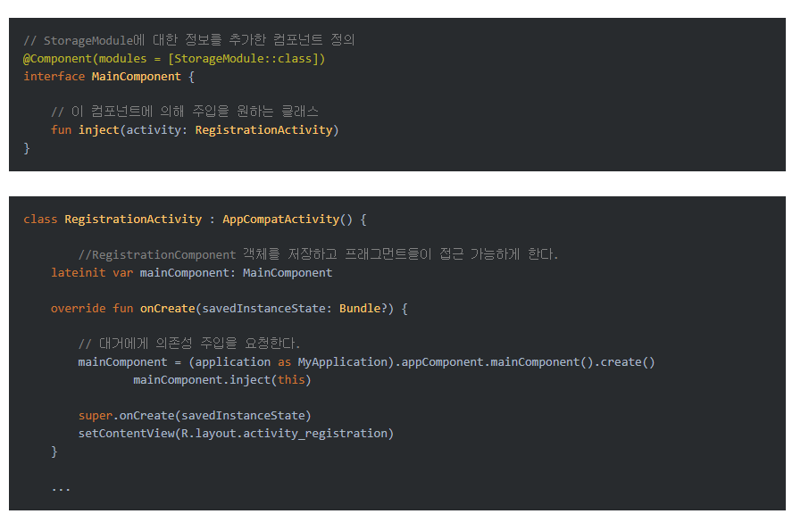 Acitivty에 RegistrationComponent를 생성하여 주입하였다. RegistrationComponent는 해당 Acitivity와 생명주기를 같이하게 되고, RegistrationViewModel도 생명주기를 같이하여 같은 객체 주입을 보장받는다. 왜냐하면 RegistrationComponent에 @ActivityScope이 붙었고 RegistrationViewModel 또한 그렇기 때문이다.