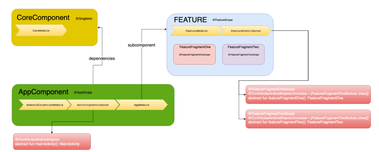 FeatureModule은 두 프래그먼트의 공통적인 종속성을 가지고, FeatureContributor는 FragmentOne과 FragmentTwo를 각각 자체 모듈과 함께 contrbuting한다.
