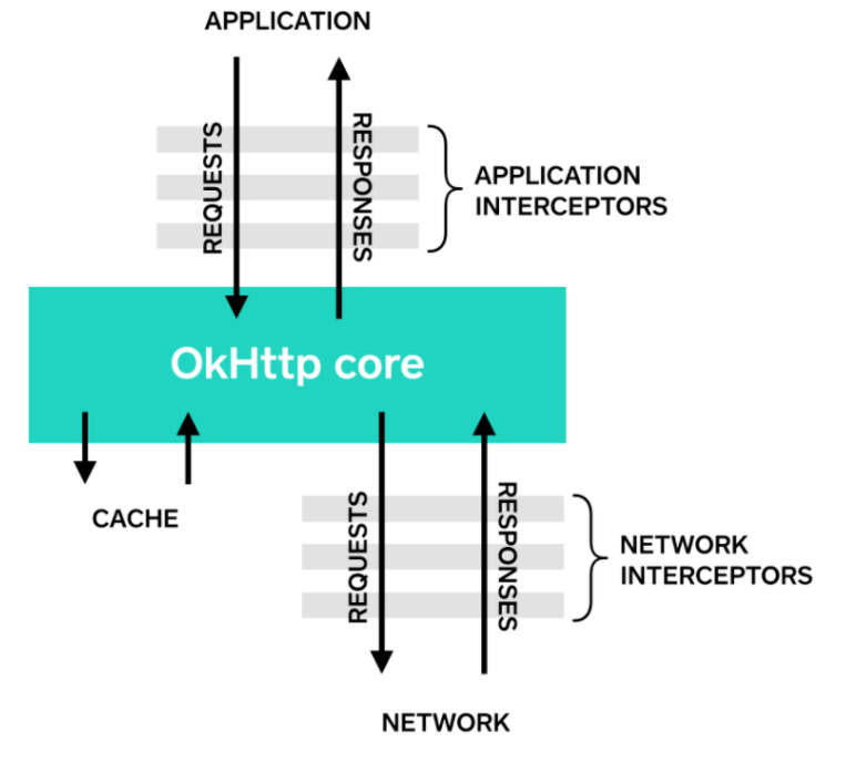 OkHttp에서 Interceptor는 App과 OkHttp core 사이에서 발생하는 App Interceptor와 OkHttp core와 Network 사이에서 발생하는 Network Interceptor로 구분된다. Network Interceptor는 contents와 직접적인 관련이 없는 로직을 구현할 때 사용하고, contents와 연관된 로직이 필요한 경우 ApplicationInterceptor를 사용한다. 이 경우는 캐시된 데이터를 가져오는 경우가 필요하기에 Application Interceptors로 추가해야 한다.