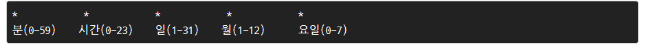 분-시간-일-월-요일 순으로 설정이 가능하다. 요일에서 0과 7은 일요일이고, 1~6이 월에서 토요일이다.