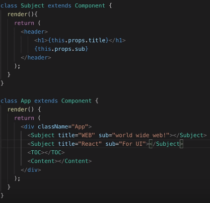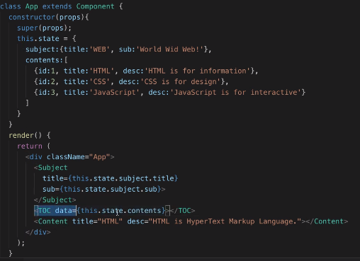 state란 사용자는 알 수 없는 컴포넌트 내부의 변동이 가능성이 높은 데이터이다. 생성자로 초기화 하는 작업이 필수적으로 요구된다. 부모 컴포넌트에서 자식 컴포넌트로 데이터를 주입할 때도 사용된다. 아래 예시를 보면 App에서는 자식 컴포넌트인 TOC의 내부구조를 알 필요가 없다.