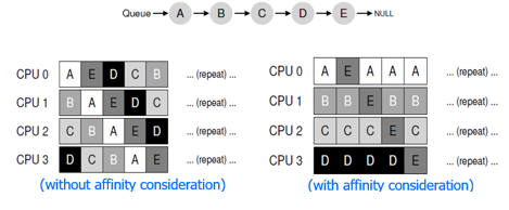 Cache affinity: 멀티 프로세서 컴퓨터에서 특정 프로세스를 실행할 때 가능하면 이전 CPU와 같은 CPU에서 실행하는게 좋다. 해당 프로세스를 실행했던 CPU는 해당 프로세스의 데이터를 캐시에 저장하고 있을 확률이 높아 메모리 접근이 적어진다.