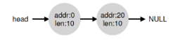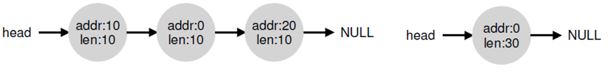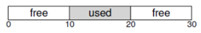 기본상태: 30B 공간에 20B의 free space가 있으며 중간에 10B 공간을 사용 중이다. Free space를 관리하는 자료구조는 연결리스트이다.