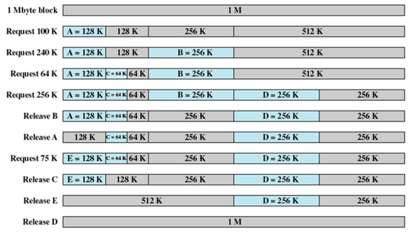 Buddy allocation: 위에서 언급한 할당 정책 이외의 가장 자주 사용되는 할당 정책이다. 2의 거듭제곱 단위로 메모리를 할당해주어 spliting과 coalescing의 간단하다는 장점이 있다.