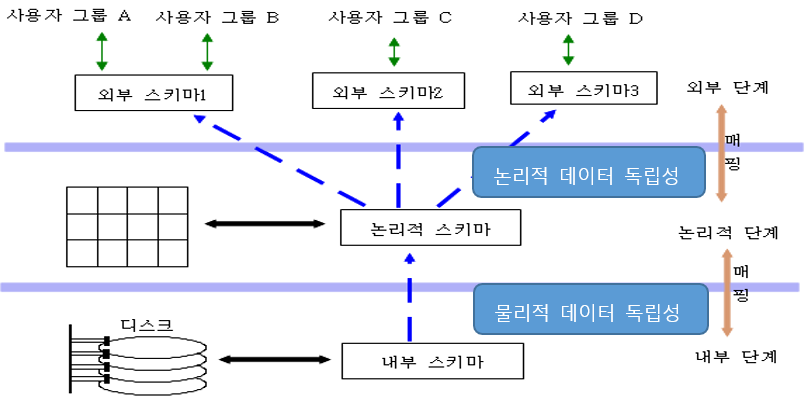 - 외부 스키마: 사용자가 보는 DB. 사용자들은 C, java의 embedded SQL을 통해 DB로 질의.